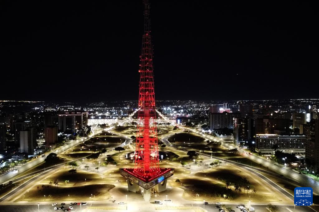8月15日晚,巴西首都巴西利亚电视塔亮起红色灯光(无人机照片)。