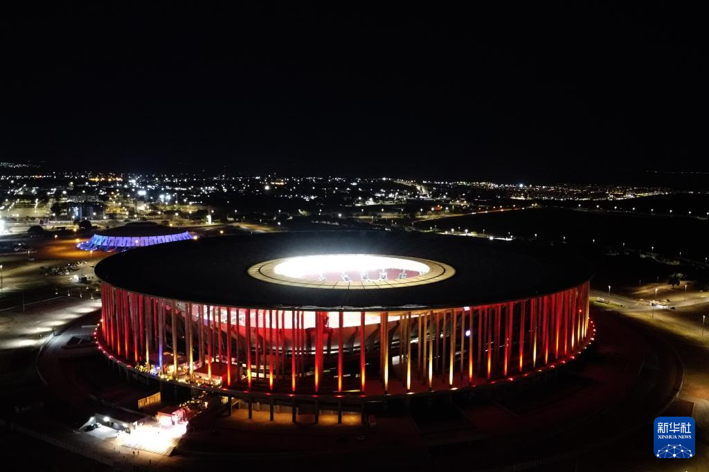 8月15日晚,巴西首都巴西利亚的马内·加林查国家体育场亮起红色灯光(无人机照片)。