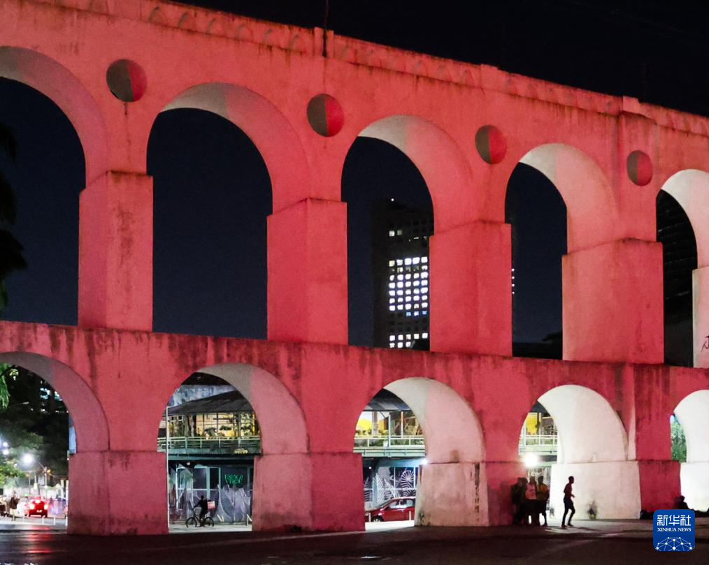 8月15日晚,巴西里约热内卢的拉帕拱门亮起红色灯光。