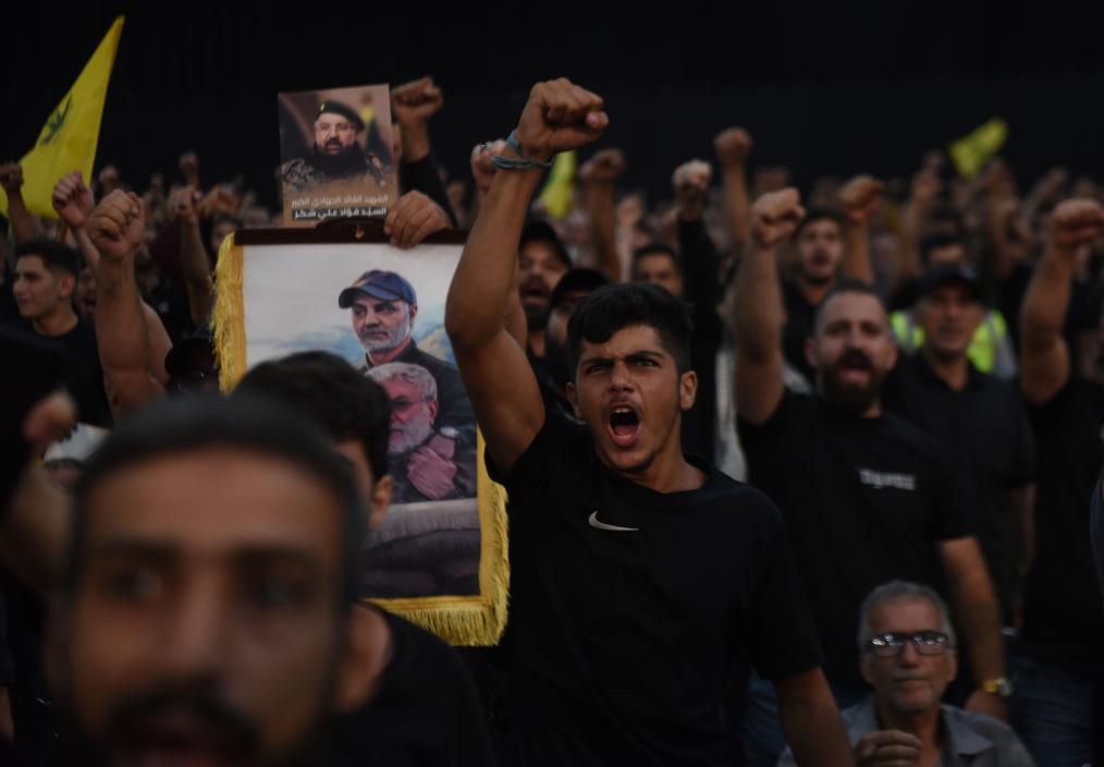 8月6日,在黎巴嫩首都贝鲁特,真主党支持者在纪念真主党高级军事指挥官福阿德·舒库尔的活动上呼喊口号。新华社发(比拉尔·贾维希摄)