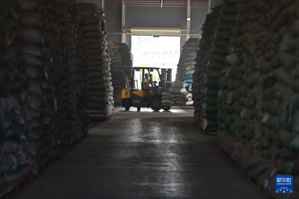 在广西仙草堂制药有限责任公司,工人在搬运青蒿原料(8月27日摄)。