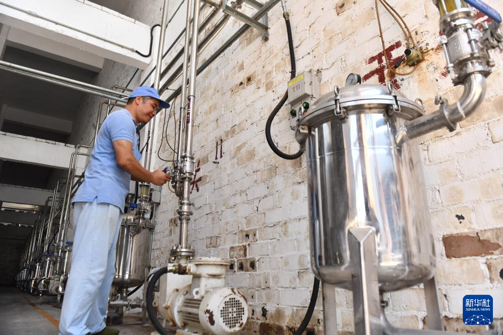 在广西仙草堂制药有限责任公司青蒿素提炼车间,技术人员在作业(8月27日摄)。