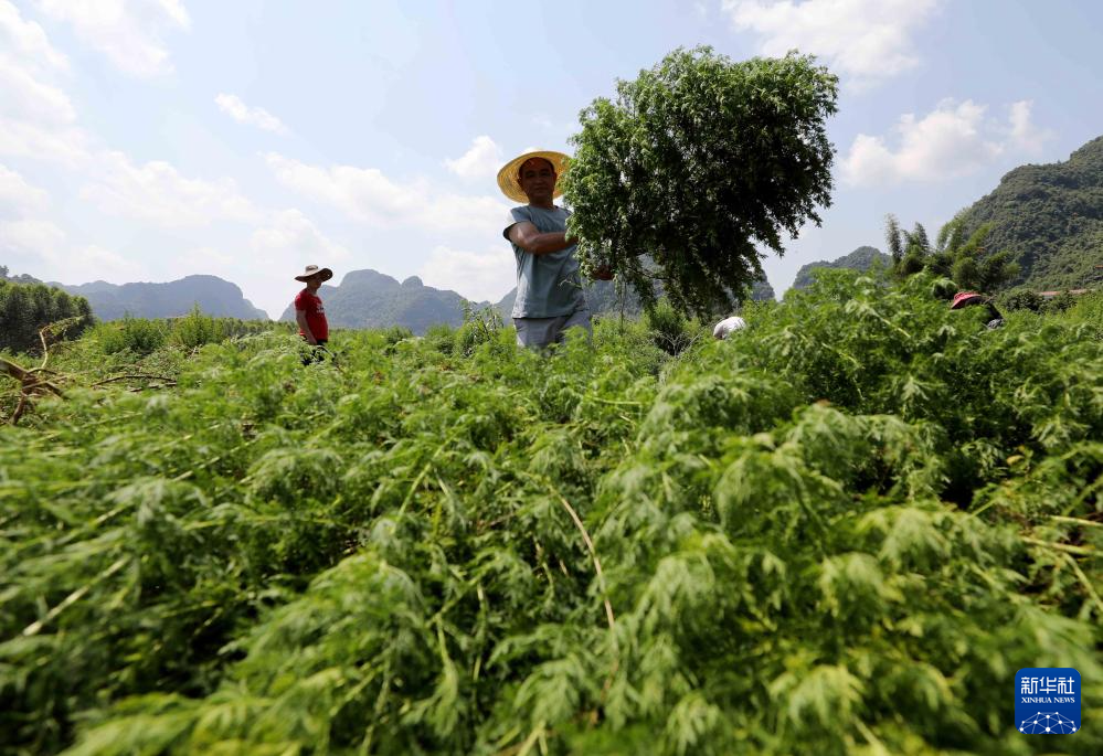 在广西仙草堂制药有限责任公司基地,工人在采收青蒿(2022年7月31日摄)。