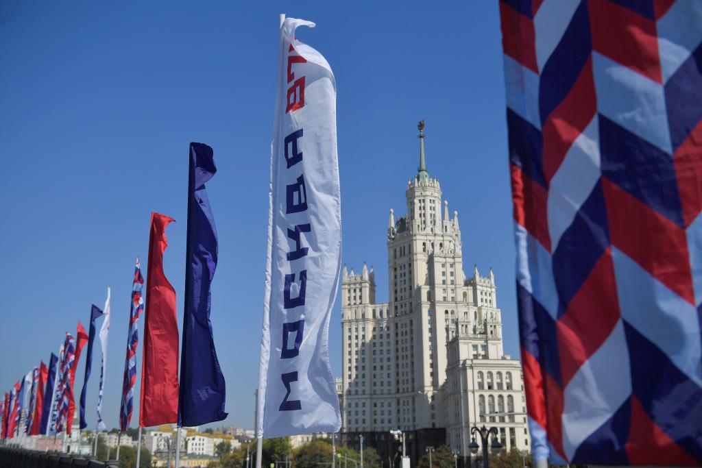 这是9月8日在俄罗斯首都莫斯科拍摄的建城877周年旗帜。新华社发(亚历山大摄)