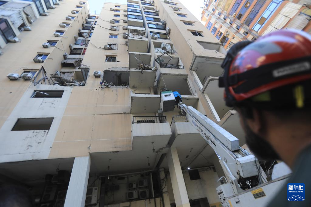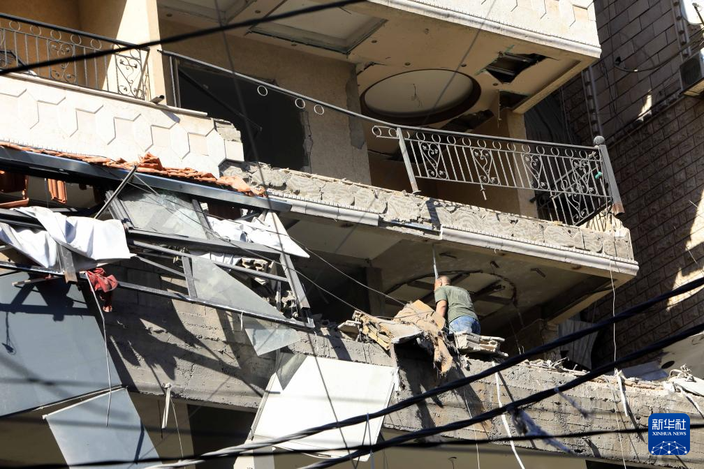 这是9月26日在黎巴嫩首都贝鲁特南郊拍摄的在以色列空袭中受损的建筑。据黎巴嫩国家通讯社26日报道,以色列战机当天用三枚导弹袭击了黎巴嫩首都贝鲁特南郊一栋住宅楼。新华社发(比拉尔·贾维希摄)