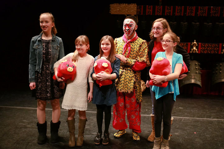 2019年2月14日,在美国马斯卡廷,当地观众在演出结束后与扮演孙悟空的中国国家京剧院演员合影。当晚,由湖北省歌剧舞剧院编钟国乐团和中国国家京剧院一团的艺术家们联袂奉献的“欢乐春节”大戏在这里上演。新华社记者 汪平 摄