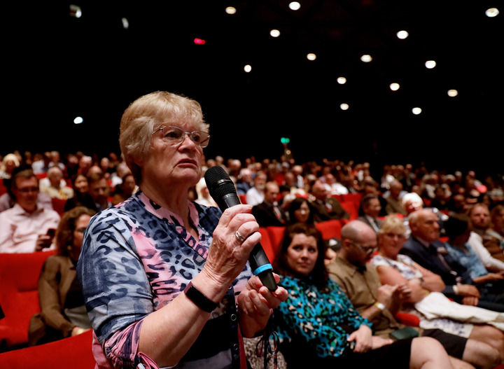 2023年8月15日,在英国伦敦,“里斯本丸”号幸存者丹尼斯·莫利之女丹妮丝·维尼在纪录片《里斯本丸沉没》放映活动上与主创人员交流。新华社记者 李颖 摄