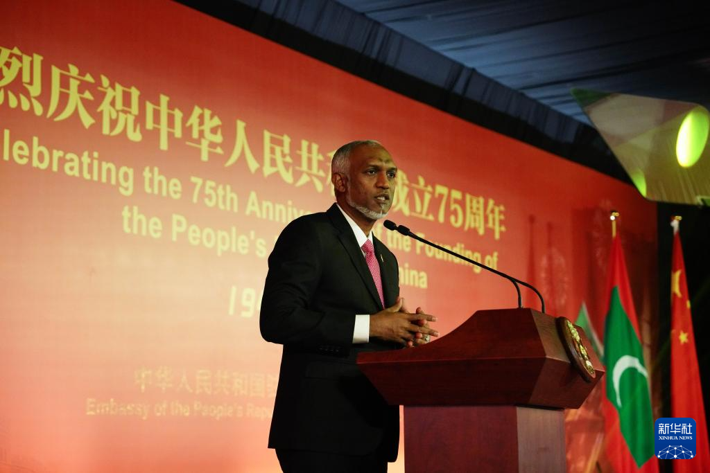 9月30日,马尔代夫总统穆伊兹在马累举行的庆祝中华人民共和国成立75周年招待会上致辞。新华社记者 陈冬书 摄