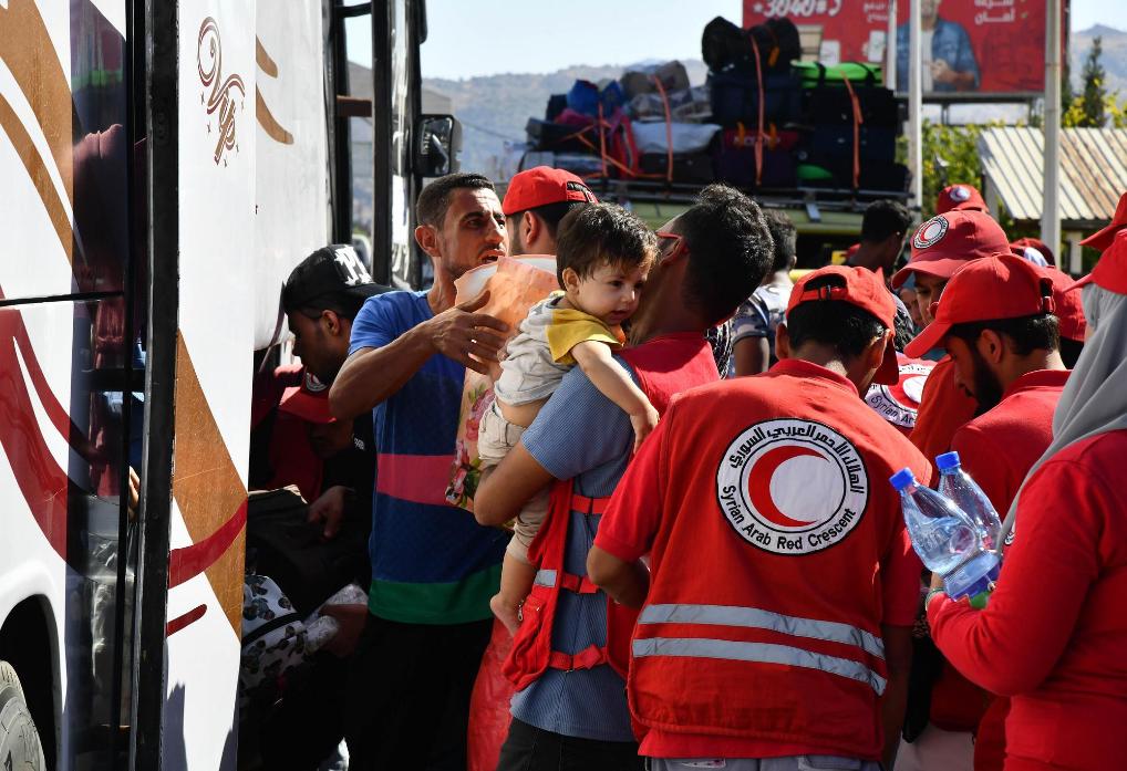 10月7日,在叙利亚与黎巴嫩边境的佳迪达·亚布斯口岸,叙利亚阿拉伯红新月会的工作人员为来自黎巴嫩的流离失所者提供帮助。新华社发(阿马尔·萨法尔贾拉尼摄)