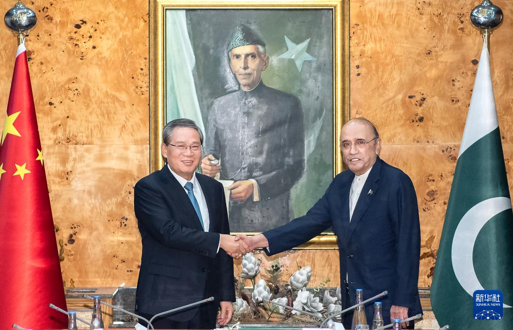 李强首先转达习近平主席对扎尔达里的亲切问候和良好祝愿。李强表示,中国和巴基斯坦是有着悠久友好传统的好邻居、好朋友、好伙伴、好兄弟,两国铁杆友谊历久弥坚、历久弥新。在习近平主席同巴方领导人的战略引领下,中巴全天候战略合作伙伴关系日益深化,高质量共建“一带一路”合作成果丰硕,友好民意基础更加牢固。中方始终从战略高度和长远角度看待中巴关系,始终将巴基斯坦置于中国周边外交优先方向,愿同巴方一道努力,推动中巴友谊与合作不断迈上新台阶,为两国人民带来更多福祉。