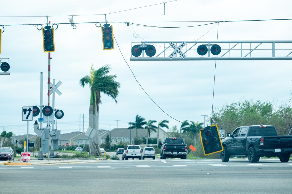 10月10日,在美国佛罗里达州坦帕,飓风“米尔顿”过境后,被损坏的交通信号灯悬在半空。新华社发(瑞安·布罗克摄)