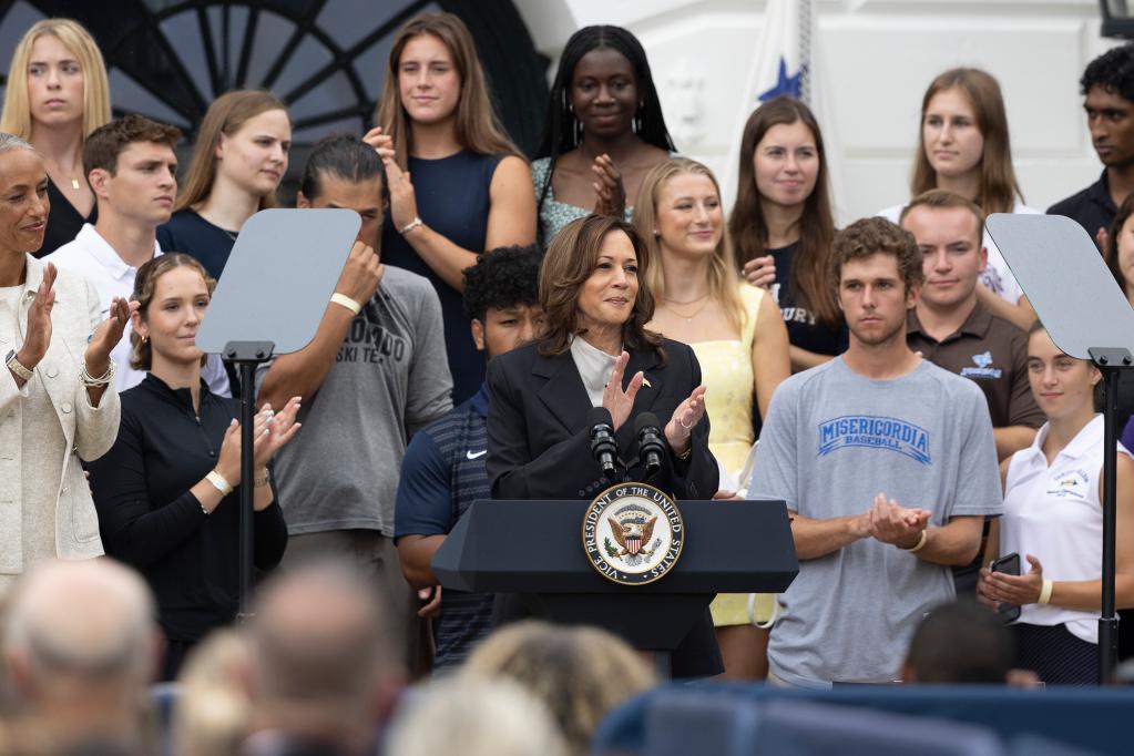 7月22日,美国副总统哈里斯(前中)在美国华盛顿白宫南草坪出席活动。 新华社记者 胡友松 摄