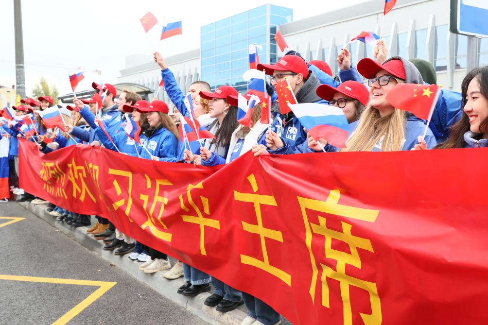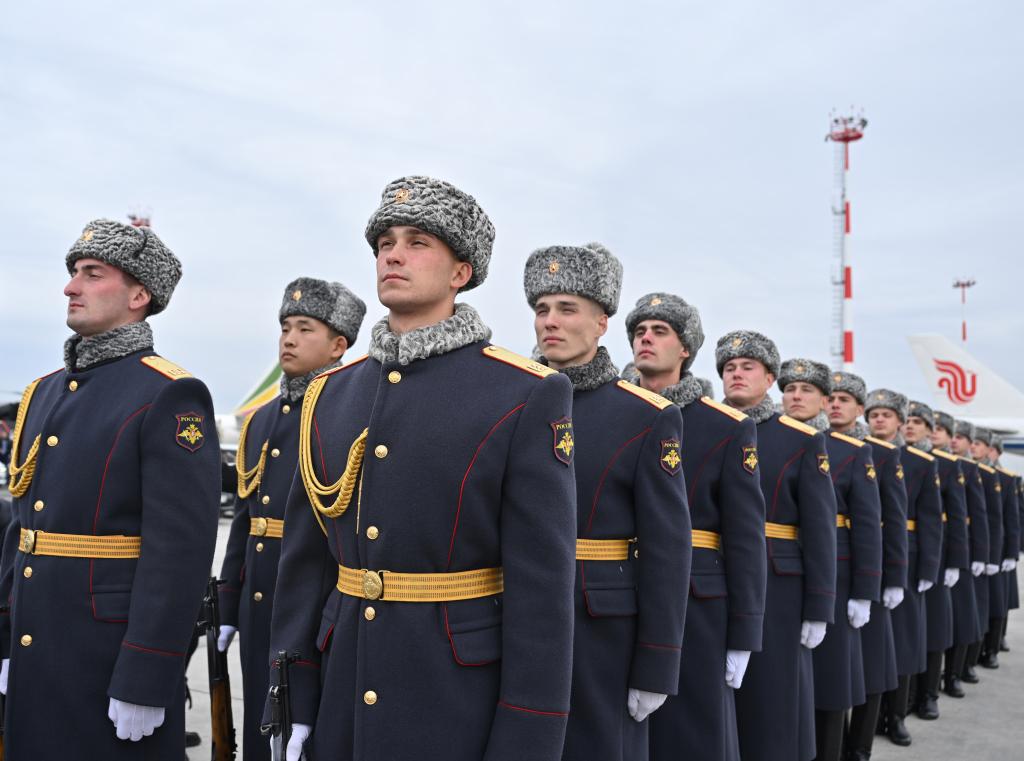 礼兵在红毯两侧列队致敬,身着民族服装的俄罗斯女青年用传统礼节表示欢迎。