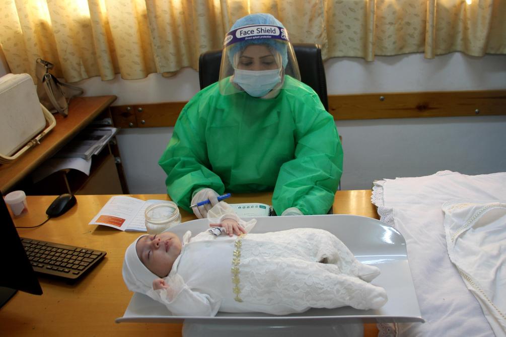 2020年12月13日,在位于加沙城的一家联合国近东巴勒斯坦难民救济和工程处的医疗中心,医生为一名婴儿测量体重。新华社发(里泽克摄)
