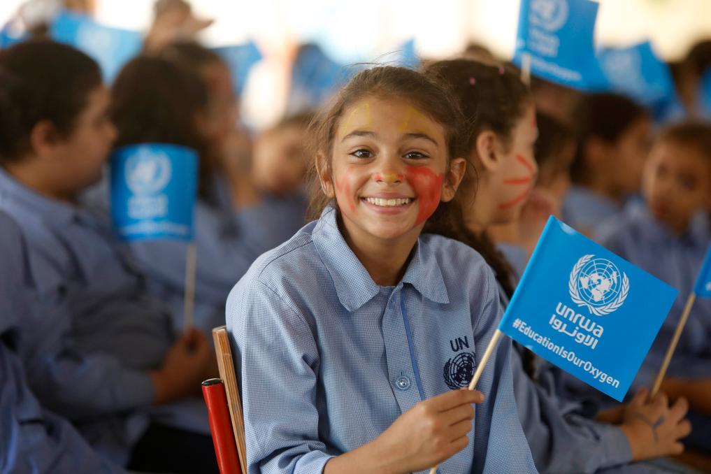 2019年9月12日,在黎巴嫩首都贝鲁特南部的耶尔穆克联合国近东巴勒斯坦难民救济和工程处学校,一名巴勒斯坦女孩参加开学典礼。新华社发(比拉尔·贾维希摄)