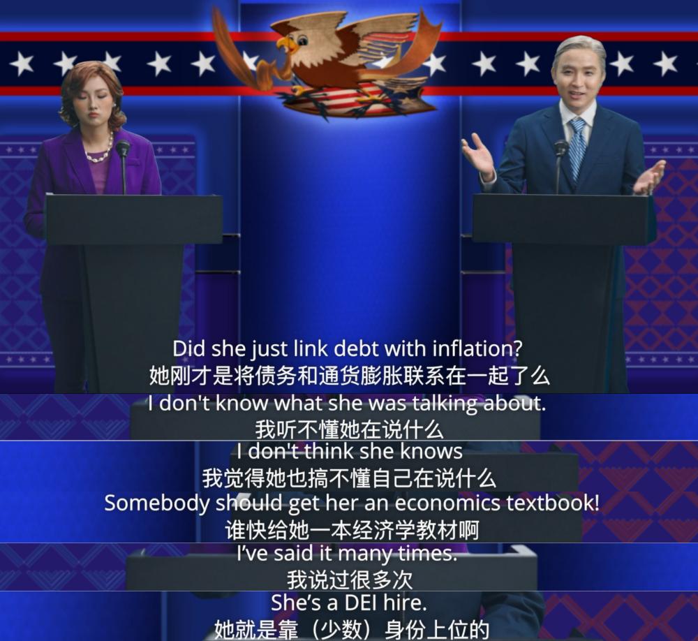 在电视辩论现场,主持人首先向两位候选人抛出了国家债务问题。面对高额债务,“上木”一番车轱辘话后咬定这是对手党派的减税政策所致;女候选人也不甘示弱,称对方党派引致的通货膨胀才是债务背后的元凶。