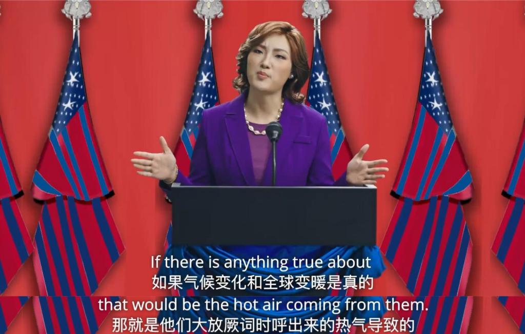 “现在,欢迎来到美坚利分众国。这是你们的选择,也是我的胜利!”“上木”总统和女总统分别发表胜选演说。两人慷慨激昂,慷慨承诺,台下穿金戴银的“金主”们欢呼雀跃。