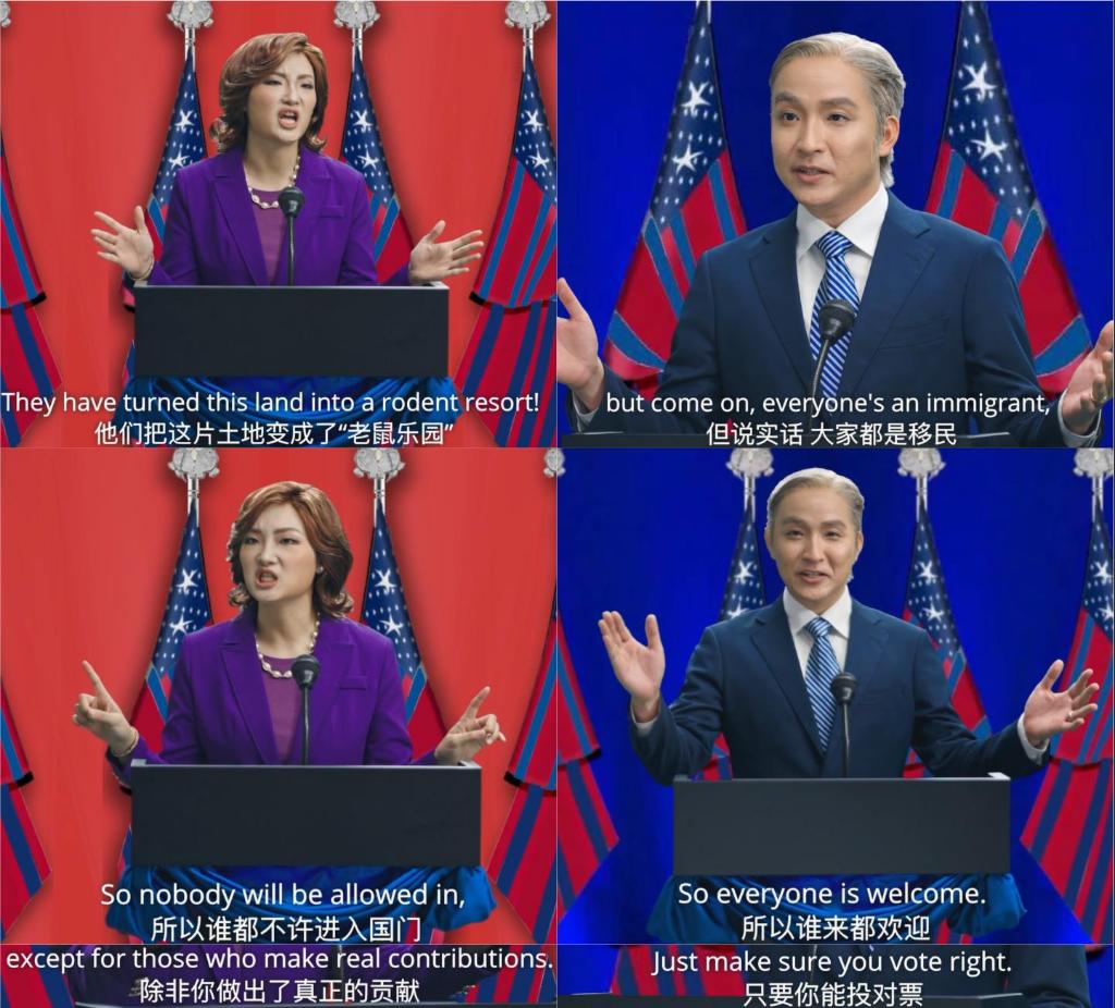 再如,谈及边境问题,“上木”总统表示“大家都是移民,除非你是美坚利原住民。所以谁来都欢迎,只要你能投对票”。女总统则表示要建造巨大边境墙来挡住“老鼠般”的非法移民,扬言“谁都不许进入国门,除非你做出了真正的贡献”。