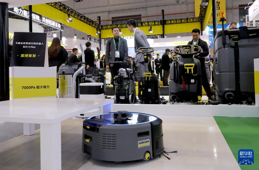 11月6日,一台卡赫全新智能扫拖机器人RCV 5 Plus(前)在进行作业演示。这是该产品在进博会上的首展首发。