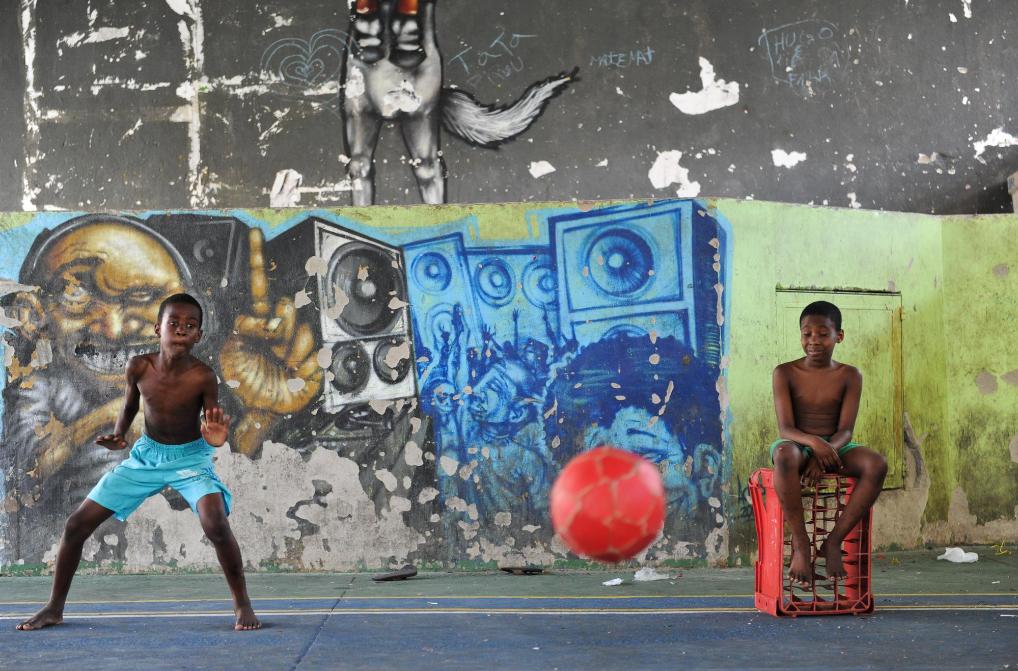 2011年12月20日,在巴西里约热内卢市中心的卡通比贫民窟内,孩子们在一块室内场地踢足球。新华社记者翁忻旸摄