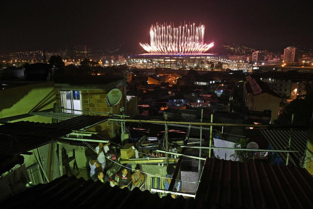 2016年8月5日,在巴西里约热内卢马拉卡纳体育场对面的曼盖拉贫民窟,一家当地居民在天台上观看奥运会开幕式。新华社记者王鹏摄