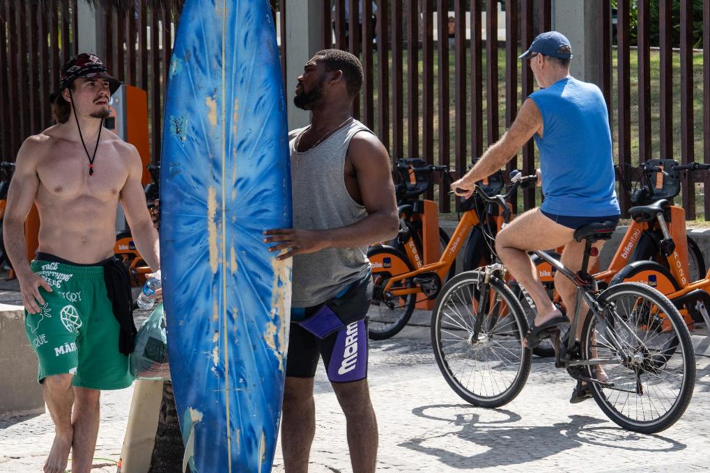 4月26日,一名冲浪爱好者(左)在巴西里约热内卢伊帕内马一处商店租冲浪板。新华社记者王天聪摄