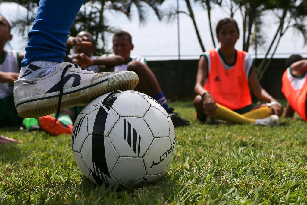 2013年12月7日,在巴西东北部巴伊亚州城市萨尔瓦多,“梦想成真”足球培训学校的学生们进行训练。新华社记者徐子鉴摄