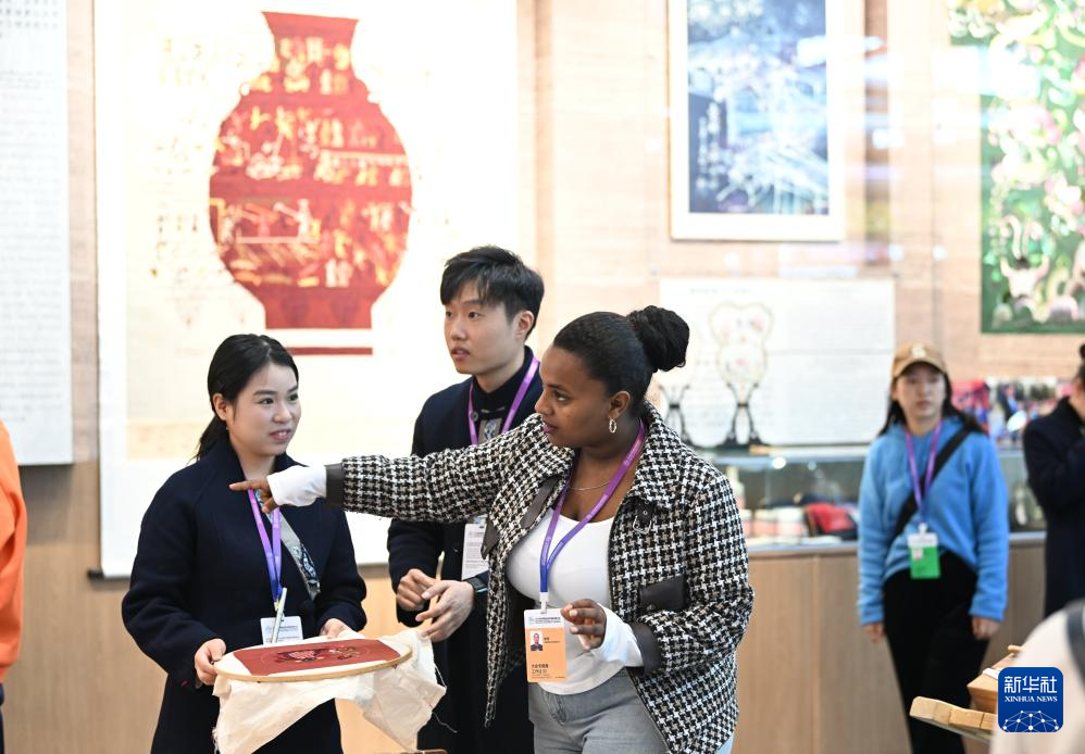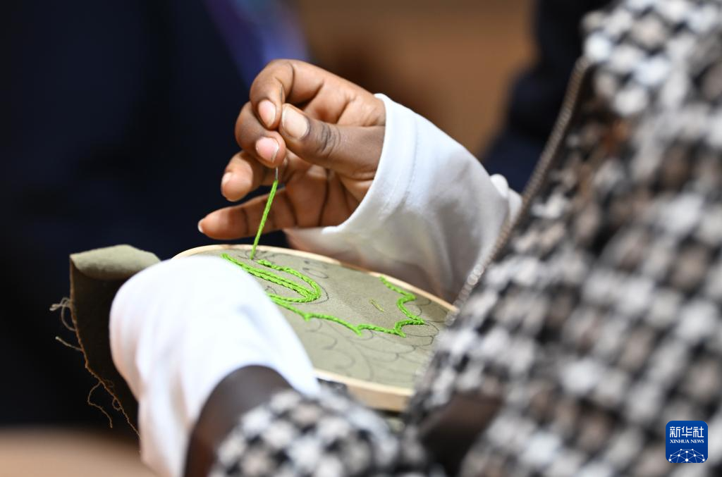 凯特在2024年世界职业技术教育发展大会上体验中国传统刺绣技艺(11月22日摄)。