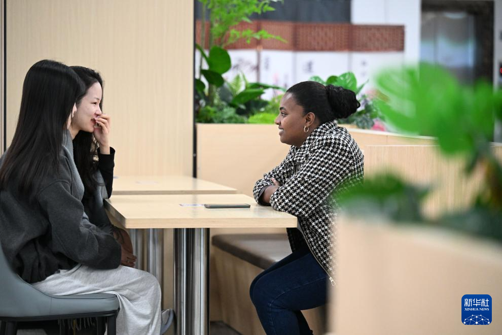 在天津职业技术师范大学学生餐厅,凯特和同学交流(11月21日摄)。