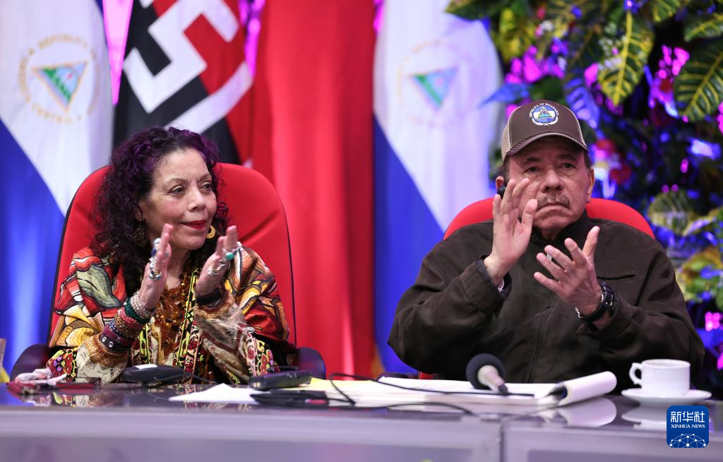 11月18日,在尼加拉瓜马那瓜,尼加拉瓜总统奥尔特加(右)出席第十七届中国—拉美企业家高峰会活动。
