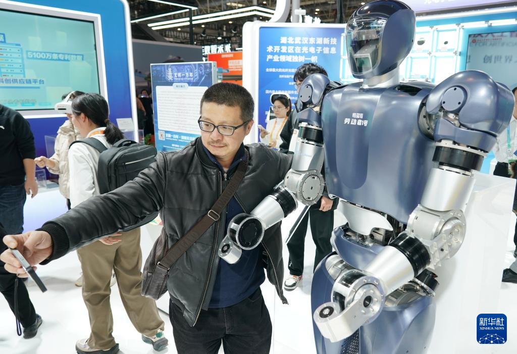 11月27日,参观者在第二届中国国际供应链促进博览会主宾省湖北展台与一款人形机器人合影。