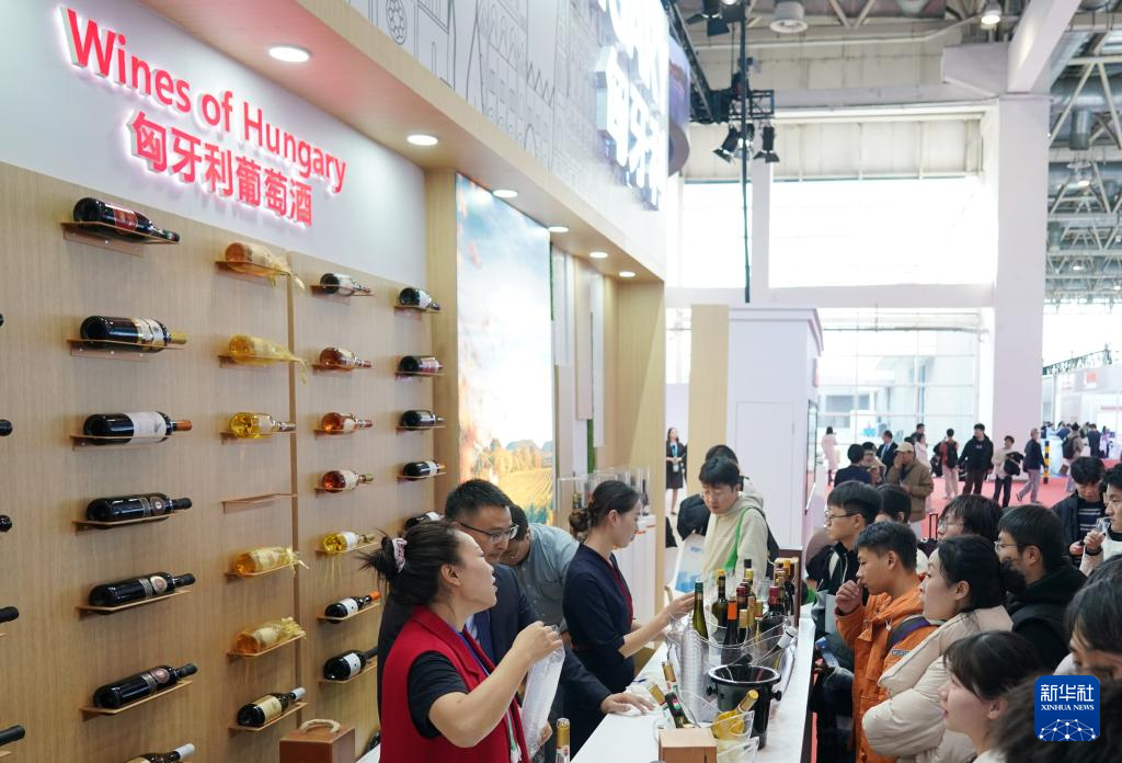11月27日,参观者在第二届中国国际供应链促进博览会匈牙利国家馆展台品尝匈牙利葡萄酒。