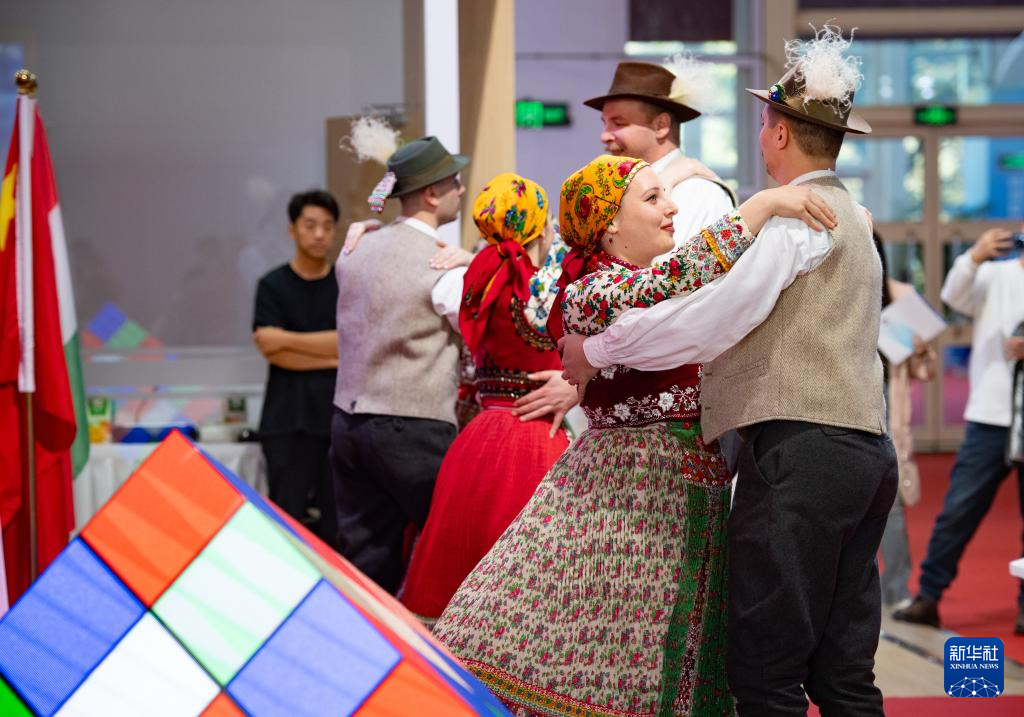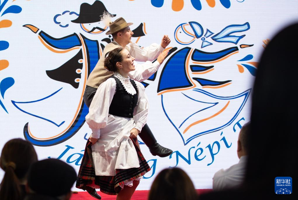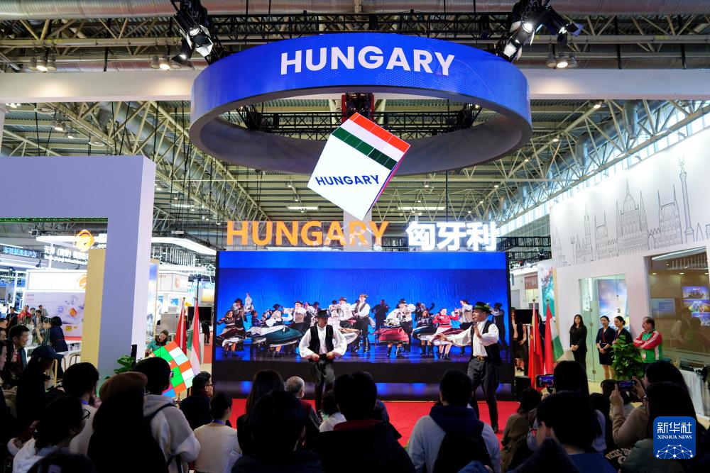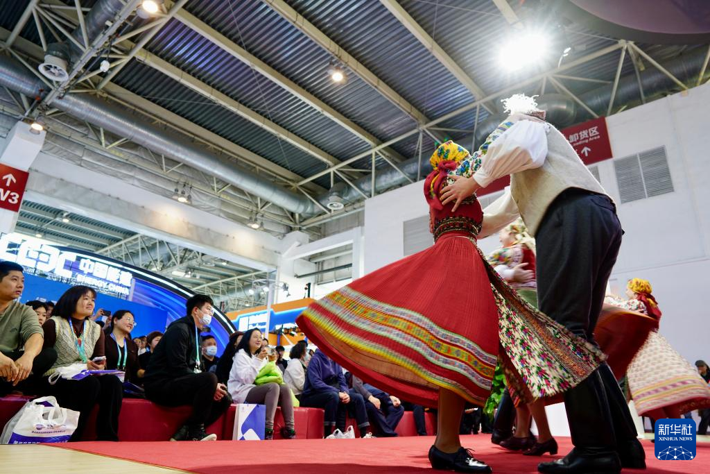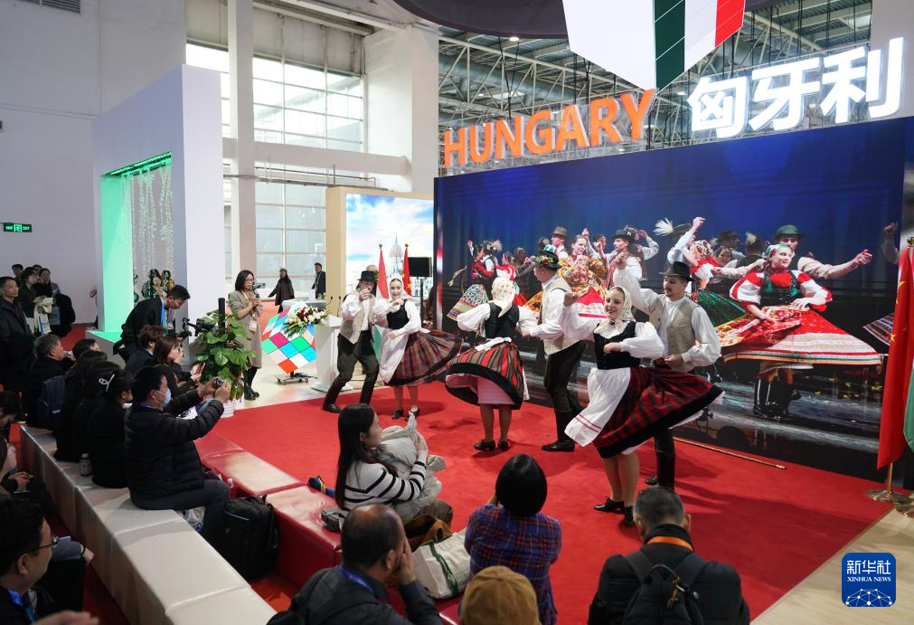 11月28日,人们在第二届中国国际供应链促进博览会匈牙利国家馆展台观看匈牙利传统民间文化表演。