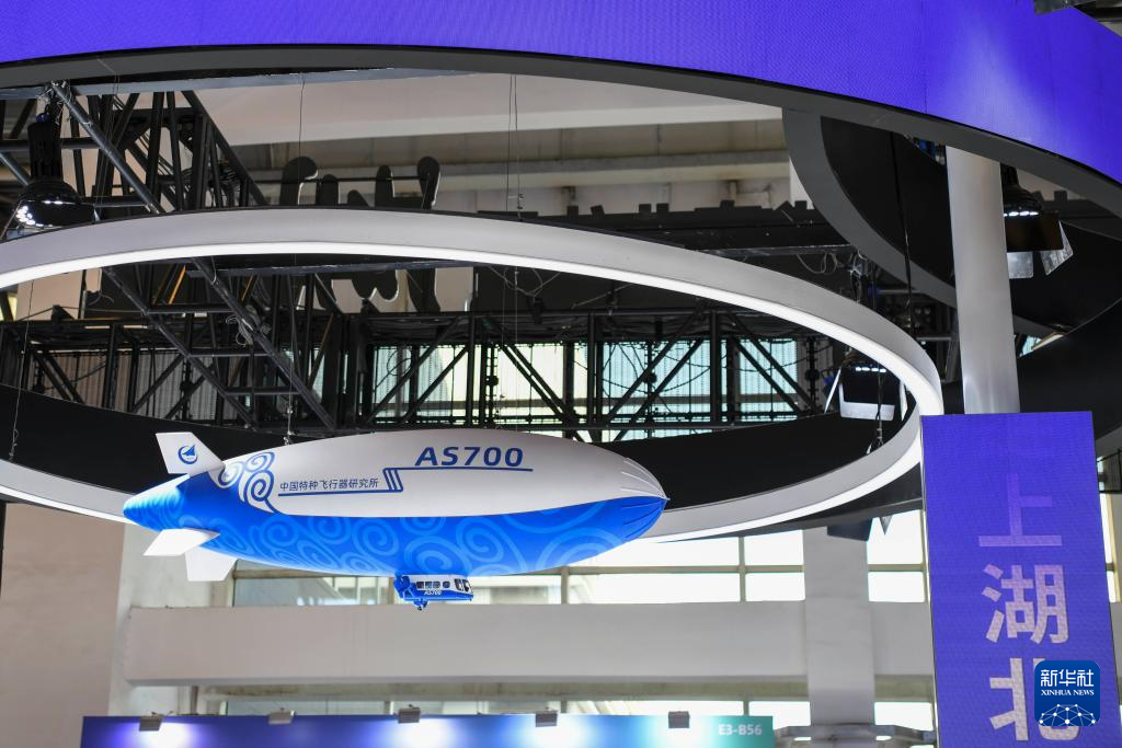 11月27日在第二届中国国际供应链促进博览会主宾省湖北展台拍摄的AS700飞艇模型。