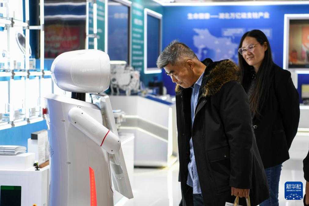 11月27日,参观者在第二届中国国际供应链促进博览会主宾省湖北展台与智能机器人互动。