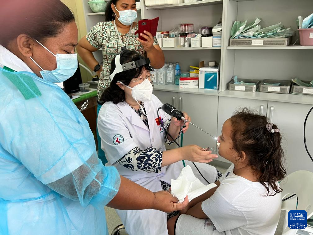 2023年6月22日,在萨摩亚首都阿皮亚,第八批中国援萨摩亚医疗队耳鼻喉科医生崔娜(中)在萨摩亚国立医院为患者诊疗。新华社发(第八批中国援萨摩亚医疗队供图)