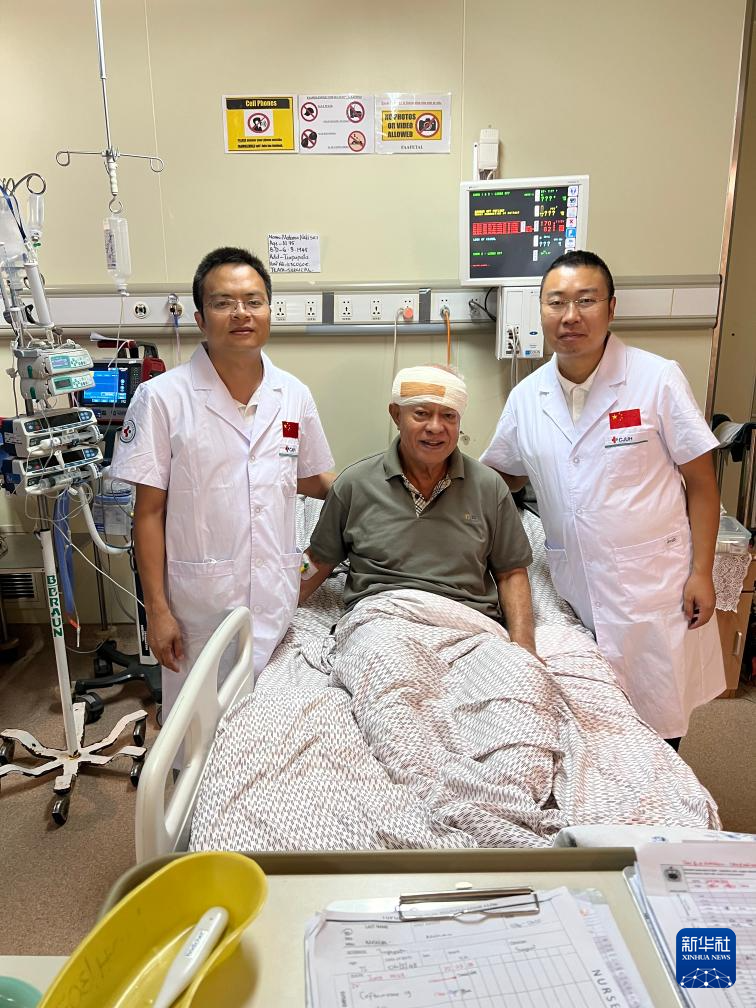 2023年6月24日,在萨摩亚首都阿皮亚,第八批中国援萨摩亚医疗队队长李清春(右)、神经外科医生梁华新(左)在萨摩亚国立医院与患者合影。新华社发(第八批中国援萨摩亚医疗队供图)