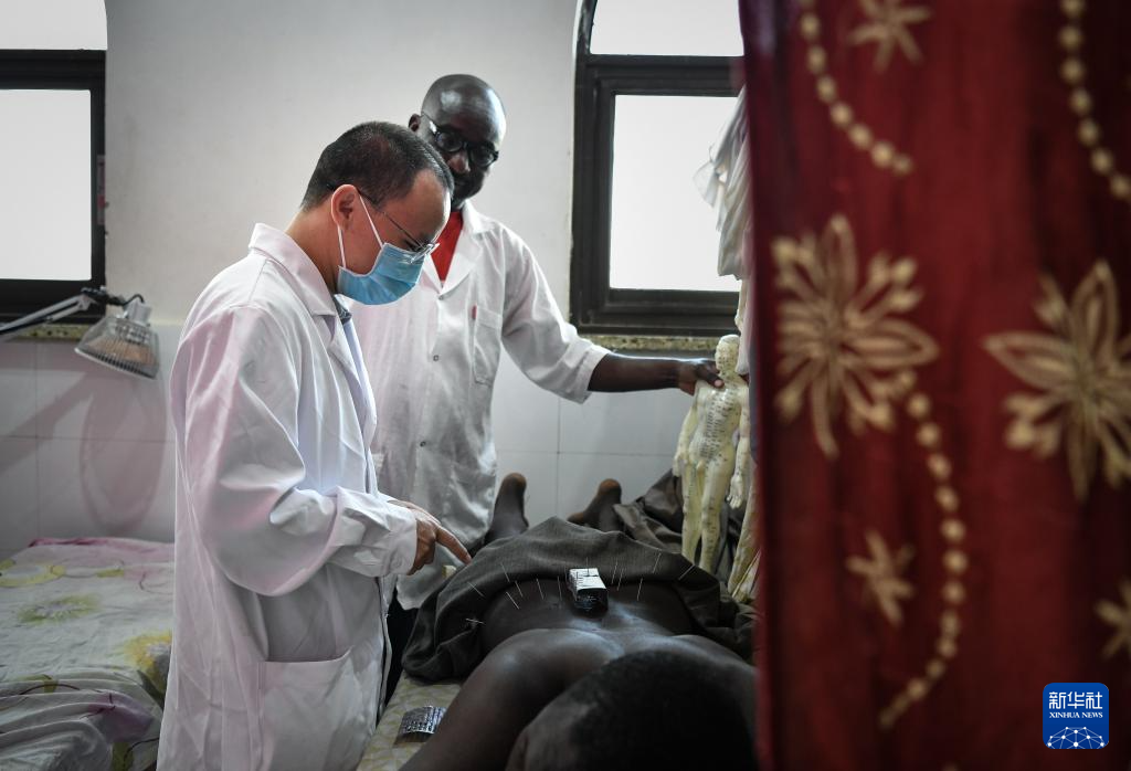 1月9日,在位于乍得首都恩贾梅纳的中乍友谊医院,中方针灸科医生为患者做针灸治疗。