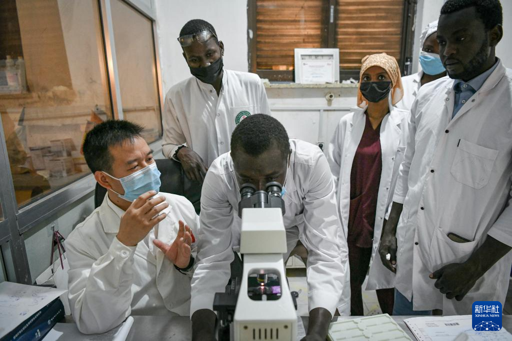 1月9日,在位于乍得首都恩贾梅纳的中乍友谊医院,中方病理科医生指导当地医护人员进行组织病理切片诊断。