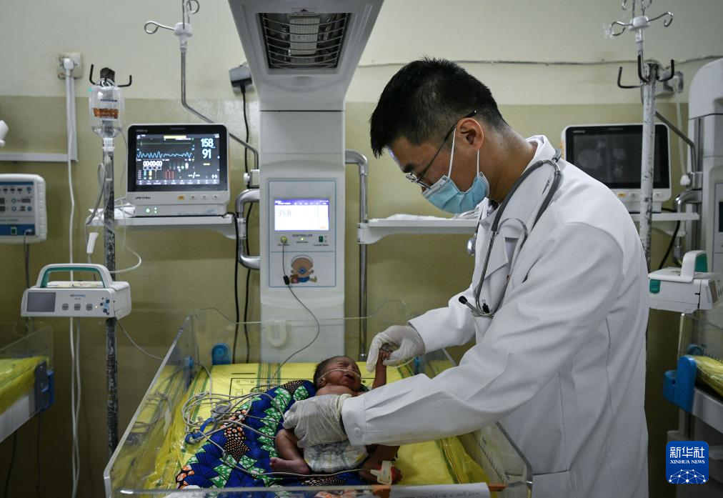 1月9日,在位于乍得首都恩贾梅纳的中乍友谊医院,中方儿科医生检查新生儿状况。