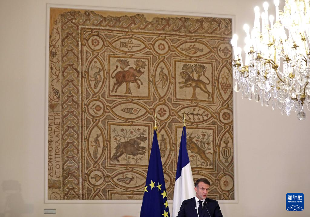 1月17日,在黎巴嫩贝鲁特附近的巴卜达宫,法国总统马克龙在联合新闻发布会上讲话。新华社发(比拉尔·贾维希摄)