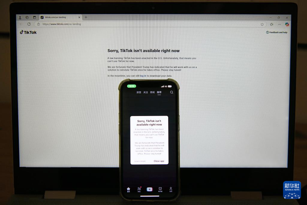 1月19日凌晨,在美国阿灵顿,TikTok手机应用程序和官网页面的弹窗通告显示“对不起,TikTok现已不可用。”新华社记者 李睿 摄