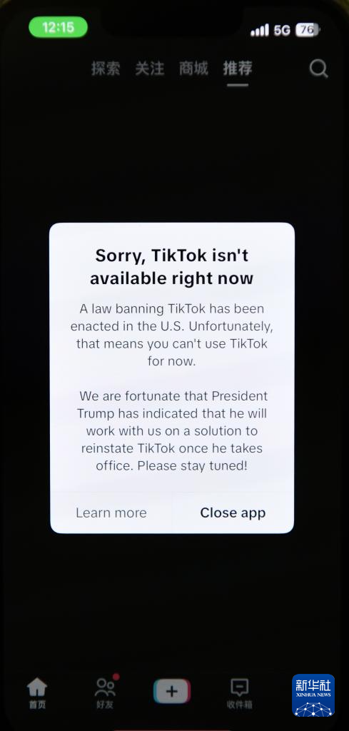 1月19日凌晨,在美国阿灵顿,TikTok手机应用程序弹窗通告显示“对不起,TikTok现已不可用。”新华社记者 李睿 摄