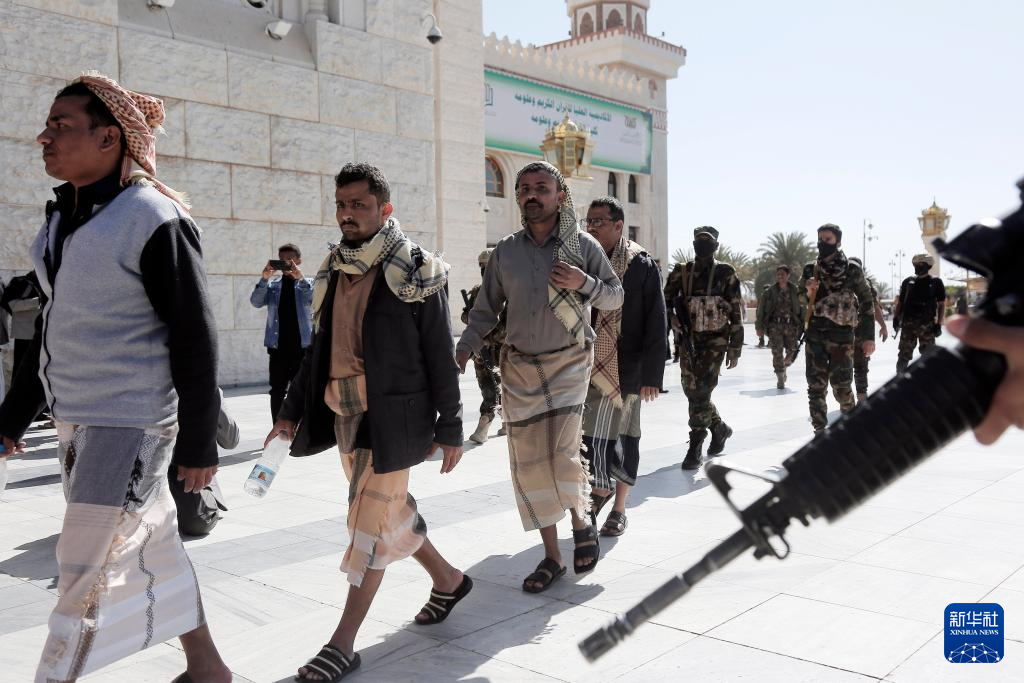 1月25日,在也门首都萨那,一名胡塞武装士兵(左一)引导获释的也门政府军被扣押人员前往新闻发布会现场。