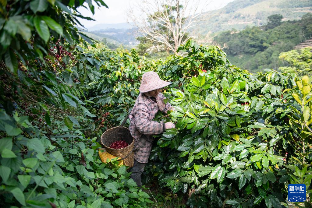 咖农在云南省普洱市思茅区天玉咖啡庄园采摘咖啡果(1月8日摄)。新华社记者 孙瑞博 摄pagebreak