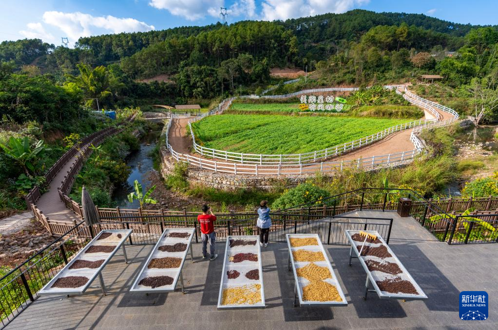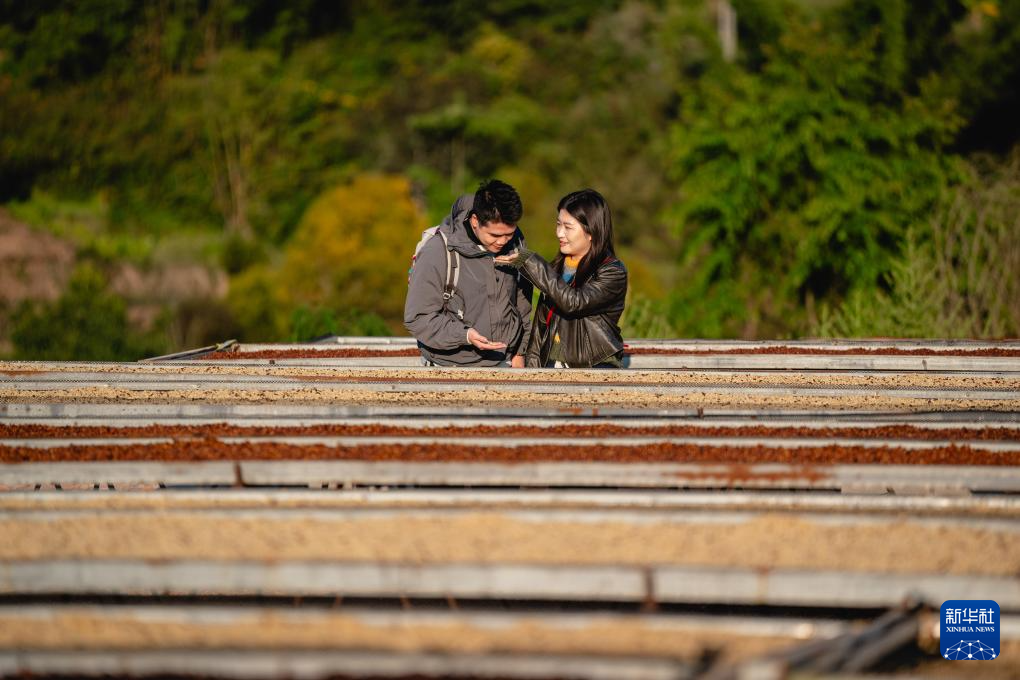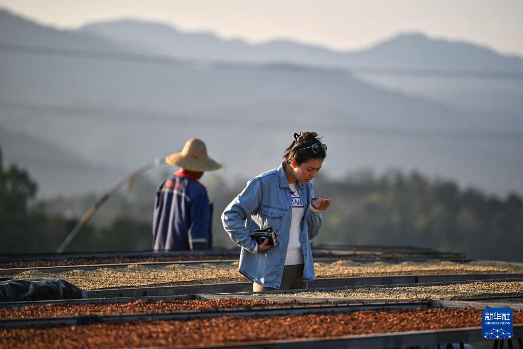 在云南省普洱市思茅区大开河梅子庄园,一名游客查看晾晒中的咖啡(1月7日摄)。新华社记者 孙瑞博 摄pagebreak