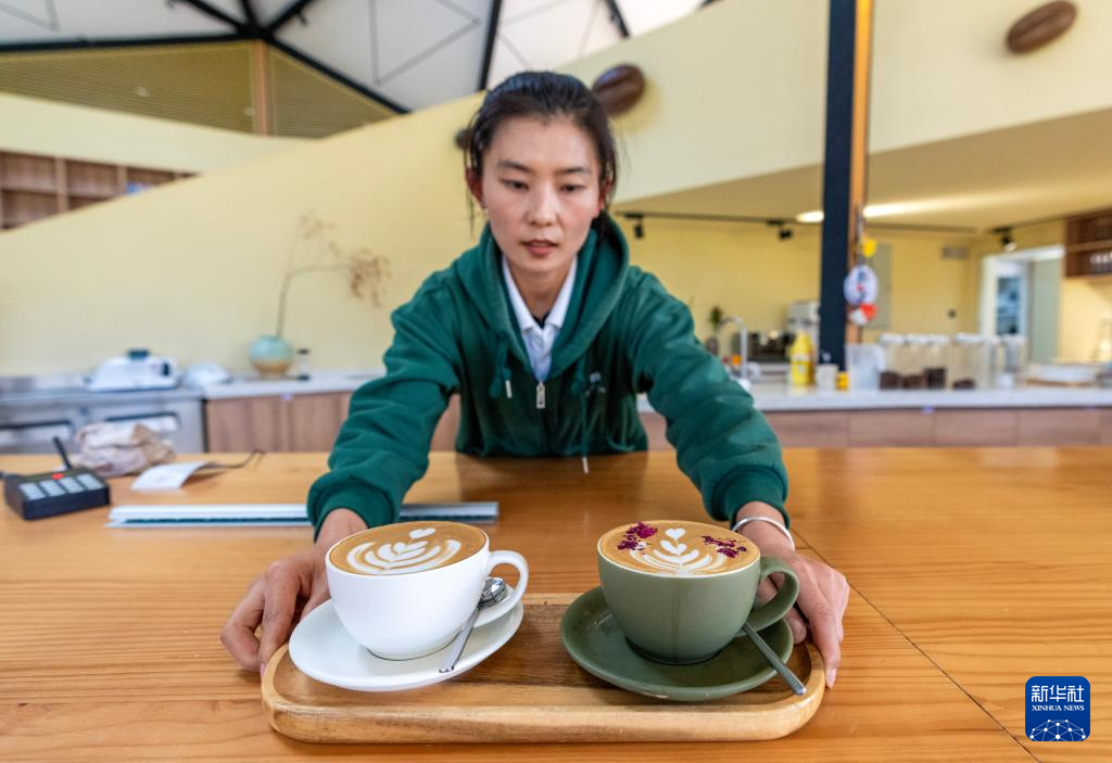 在位于云南省普洱市思茅区的“美丽星村 有风咖谷”咖啡体验中心,工作人员为顾客端上咖啡(1月7日摄)。新华社记者 陈欣波 摄pagebreak