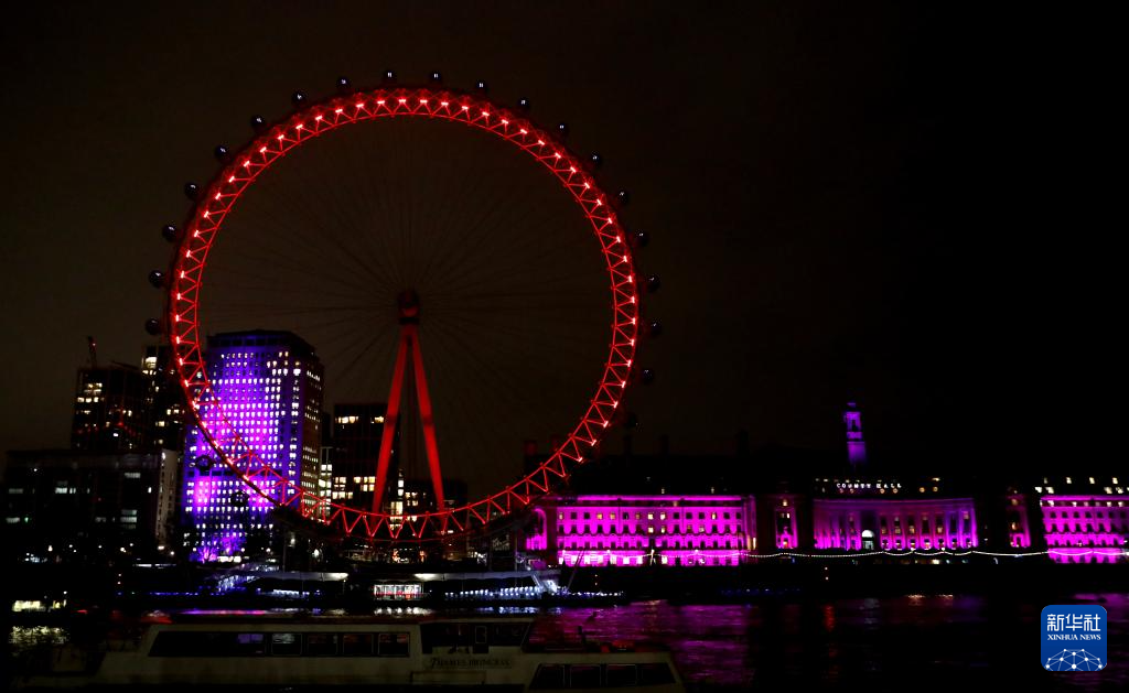 1月28日,英国首都伦敦的地标建筑“伦敦眼”亮起红色灯光。新华社记者 李颖 摄