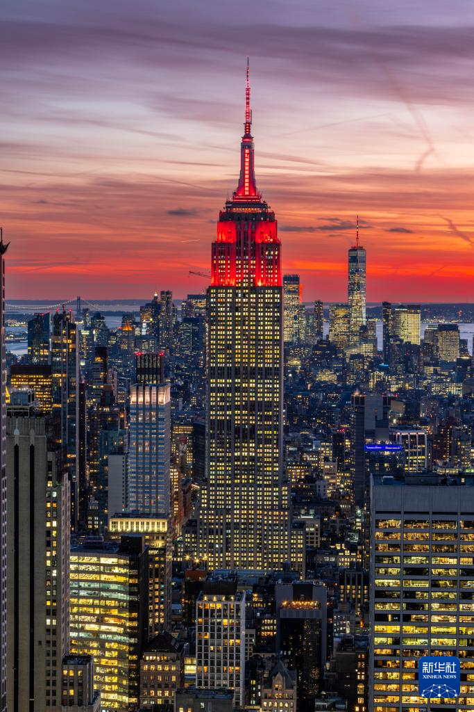 1月28日,美国纽约帝国大厦亮起红色灯光。新华社发(周焕新摄)