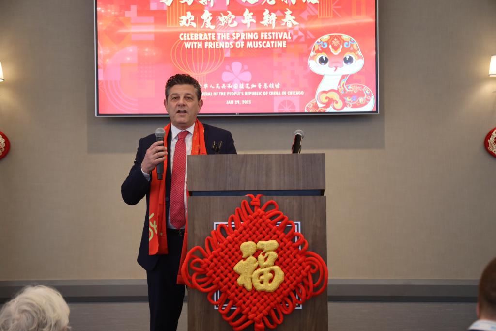 当地时间1月29日,在马斯卡廷,艾奥瓦州友好委员会董事会成员卢卡·贝隆与中美学生欢度蛇年新春。新华社记者徐剑梅摄